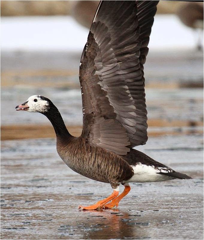 I thought the extent of white on the head of the bird above was interesting, but Cathy's next bird has even more.  Turns out that this seems to be quite common in Greater White-fronted Goose x Cackling Goose hybrids - more so than Greater White-fronted Goose x Canada Goose hybrids for some reason.  Joern has also pointed out that this phenonemon can occur in other hybrids such as Lesser White-fronted x Barnacle.  Some discussion took place about whether this bird could involve Ross's Goose but note the bright orange legs.  The undertail-coverts are marked as is often the case with Anser x Branta hybrids.