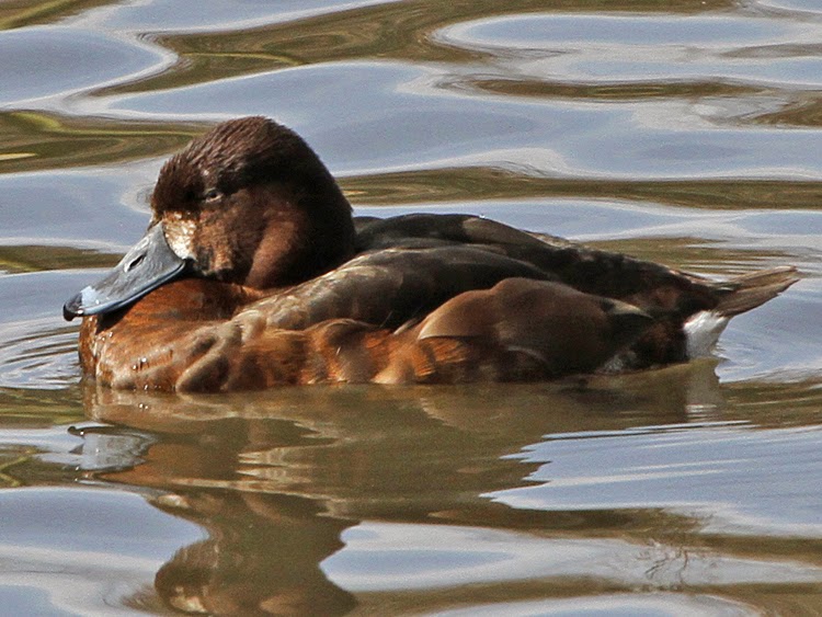 Female Tufted Ducks with a lot of white around the bill and little or no tuft showing are often touted as possible Tufted Duck x Scaup hybrids (or even misidentified as pure Scaup) but in most cases they are just Tufted Ducks. The bird below differed from these in that I got a good clear look at the head over a period of time and its feathers were ruffled and raised sufficiently for me to establish that it certainly did not have an elongated tuft, rather than this simply not being visible. Moreover the structure seemed quite Scaup-like, although it was as small as a Tufted Duck. At some angles the upperparts and flanks seemed to lack any grey feathering (although they were paler than on the accompanying Tufted Ducks) but at some angles there seemed to be a distinct greyish tone to upperparts and flanks. Some photos seem to hint at an extensive dark tip to the bill as on Tufted Duck but in the field this seemed to be lacking - it certainly was not as obvious as it often is on Tufted Duck.