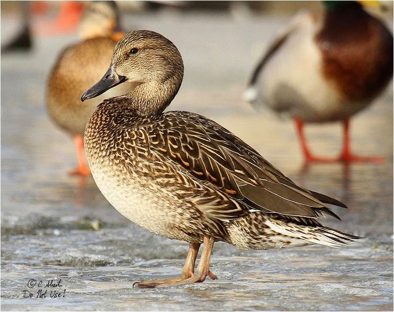 "Size was SLIGHTLY smaller than the female Mallards. Obvious green speculum feathers (where a female mallards are normally blue), bill blue, legs an interesting pink. Feather edging an the back an interesting cinnamon tone.